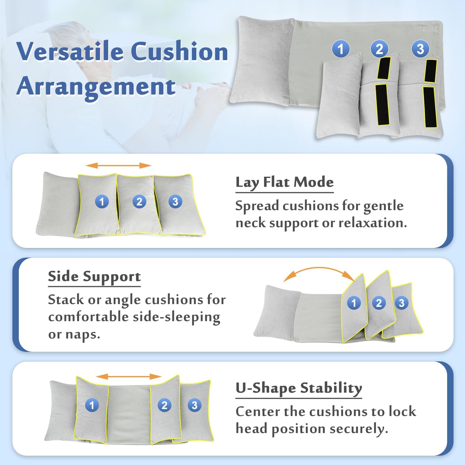 Finding the right support for recovery or elderly care can be difficult. Mybow Adjustable Head Positioning Pad is the perfect solution — a modular attachment that upgrades your current sleep setup with medical-grade stability. ⚠️ Important: Designed to Be Used on Top of a Pillow Please note that this product is not a standalone pillow. It is a specialized positioning overlay designed to attach securely over your existing standard pillow. This allows you to keep the height and comfort you are used to while adding the necessary lateral support to prevent the head from rolling or tilting. ✅ Fully Customizable "1+3" Design: One size never fits all. Our system features a fabric base with one fixed side cushion and three movable cushions equipped with strong hook-and-loop fasteners. You can easily detach and reposition the cushions to adjust the width. Whether you need a tight fit for strict immobilization or a looser fit for comfort, it contours perfectly to your specific head size. ✅ Stays Firmly in Place: Standard cushions often slide away during the night. Our pad solves this with two detachable 47.5-inch straps on the back. Simply strap it around your standard pillow, recliner chair, or high-back wheelchair. This ensures the head supports stay exactly where you need them without shifting. ✅ Ideal for Post-Surgery & Elderly Care: Essential for anyone needing to maintain a face-up position. It is perfect for post-surgery recovery (facial/eye surgery) to prevent face contact with bedding, and provides crucial neck support for bedridden or elderly users to prevent head drooping. ✅ Soft, Breathable & Washable: Filled with premium polyester fiberfill, it offers soft, cloud-like support that won't irritate sensitive skin. The modular design makes hygiene easy — the base and cushions are machine washable, ensuring a fresh resting environment every day.